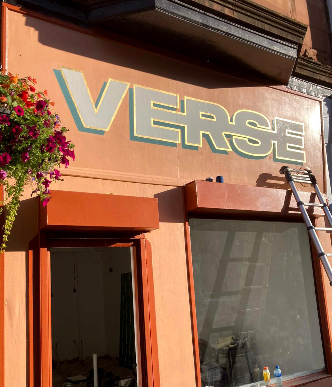 Fascia painted and gilded with 23.5 carat gold for Verse coffeeshop on Deanston Drive. The original logo was designed by Gosia Grant, and adapted by me for the sign. A gorgeous independent coffee shop with the best chai lattes!